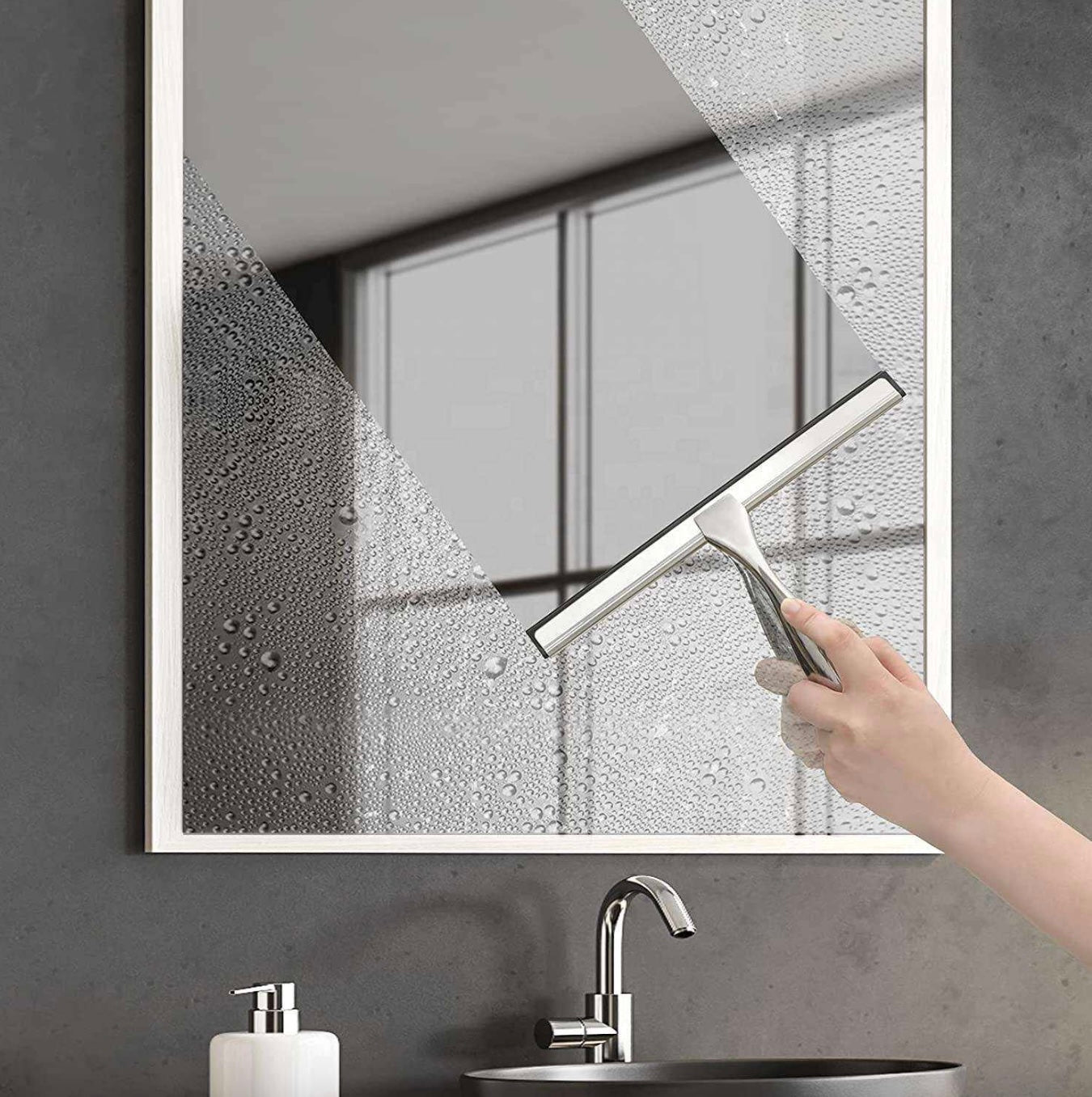 Mantén tu baño siempre impecable con este Limpiador Squeegee de acero inoxidable. Su goma flexible elimina el agua de vidrios, espejos y mamparas en una sola pasada, evitando manchas de sarro y vapor. Incluye ganchos adhesivos para colgarlo sin perforar. Elegante, resistente y práctico, ideal para dejar tus superficies brillantes todos los días.